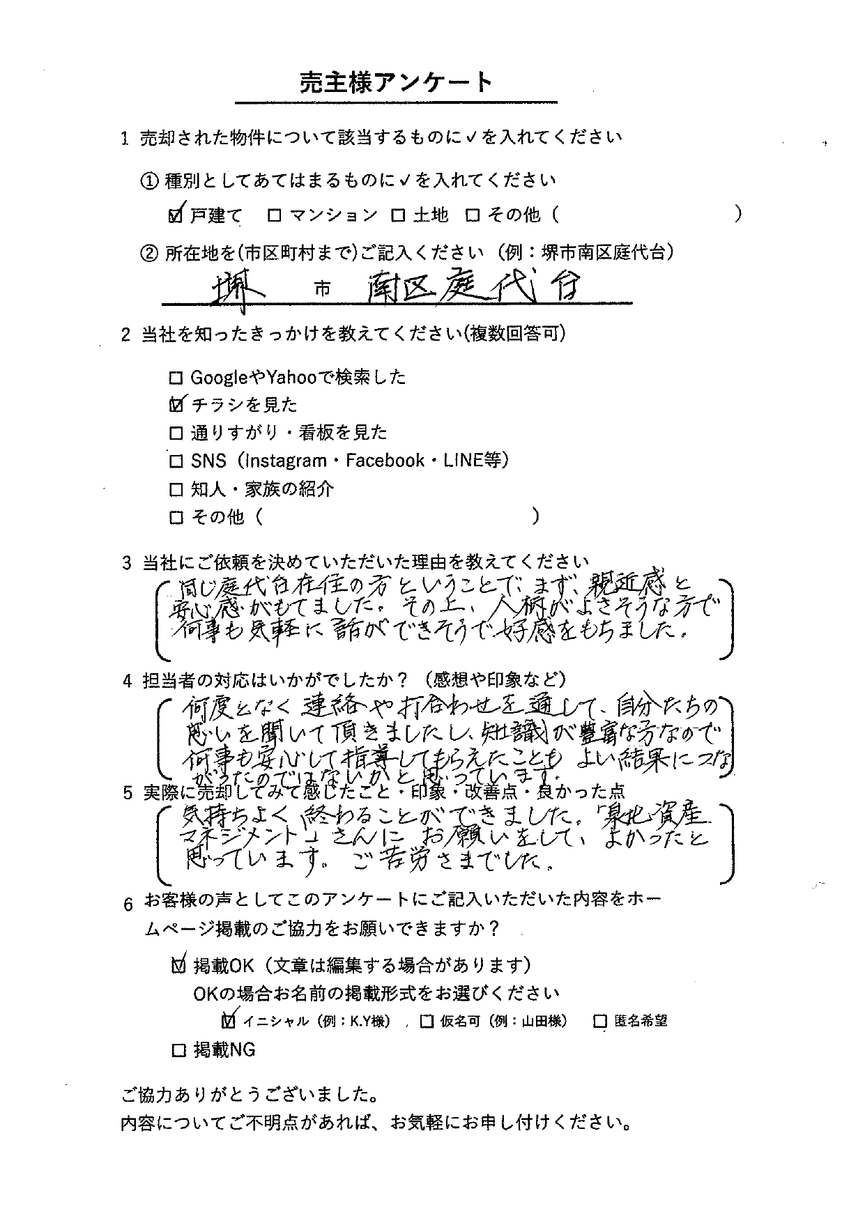 - 気持ちよく終わることができました。「泉北資産マネジメント」さんにお願いをして、よかったと思っています。ご苦労様でした。